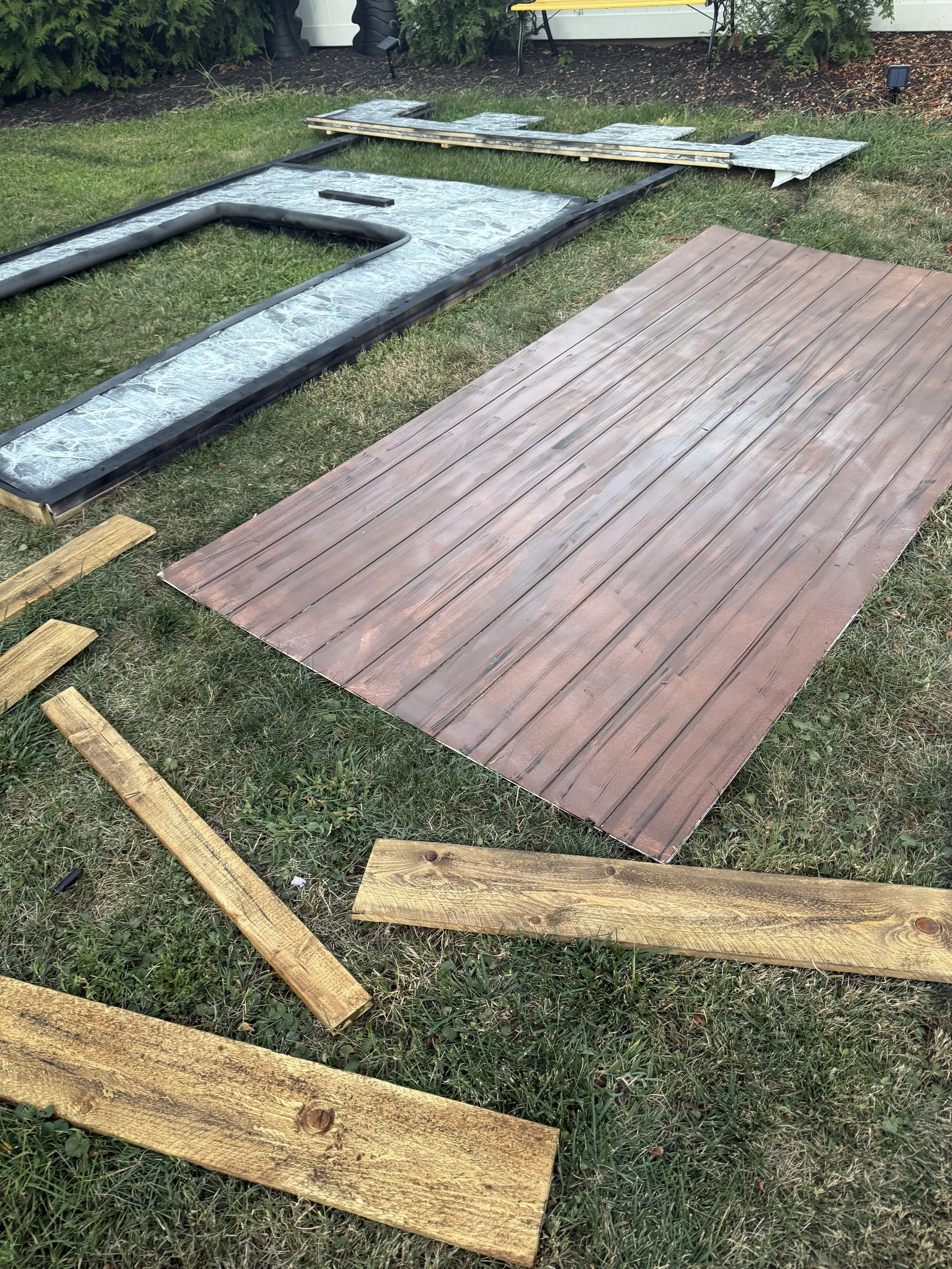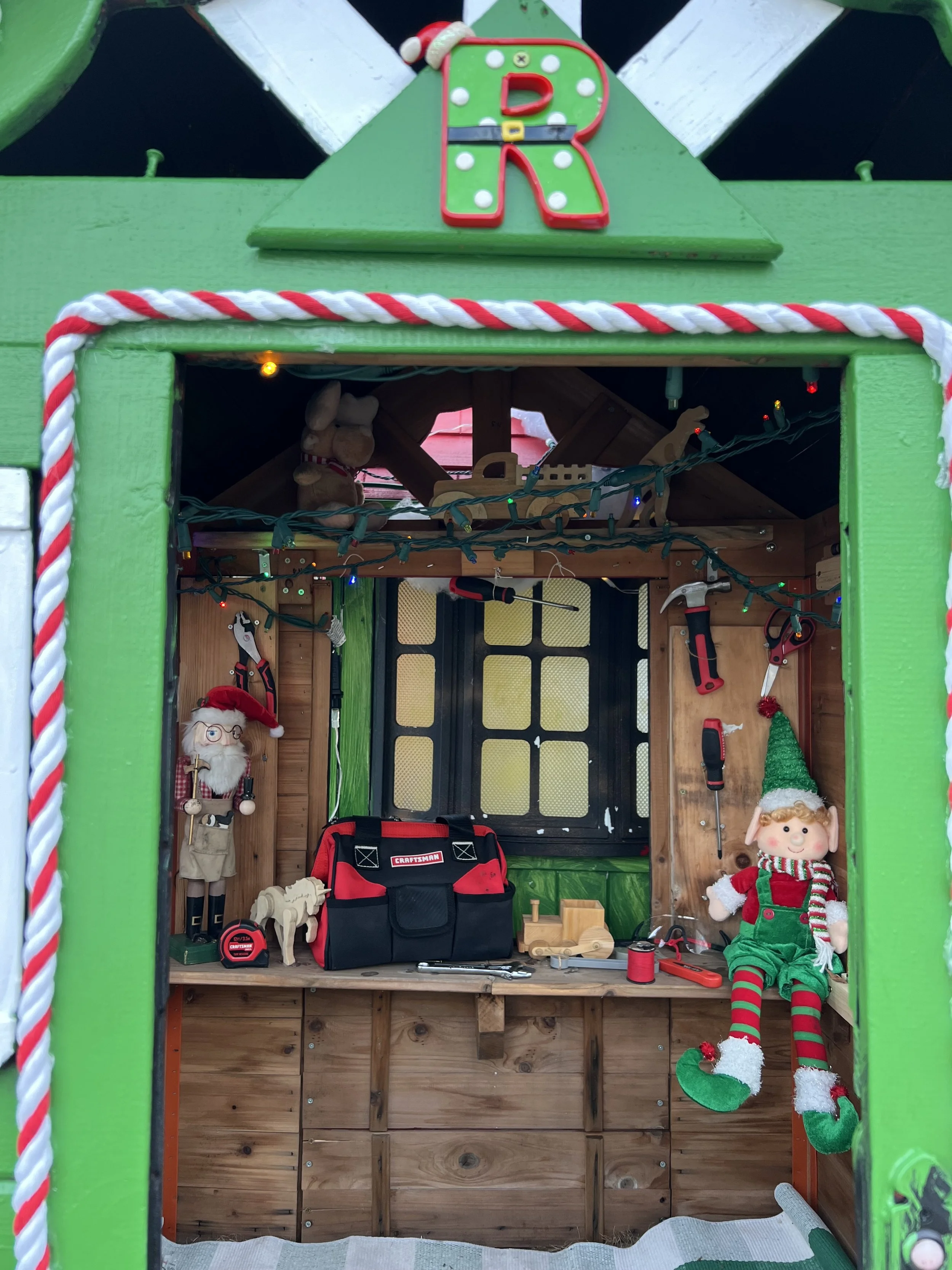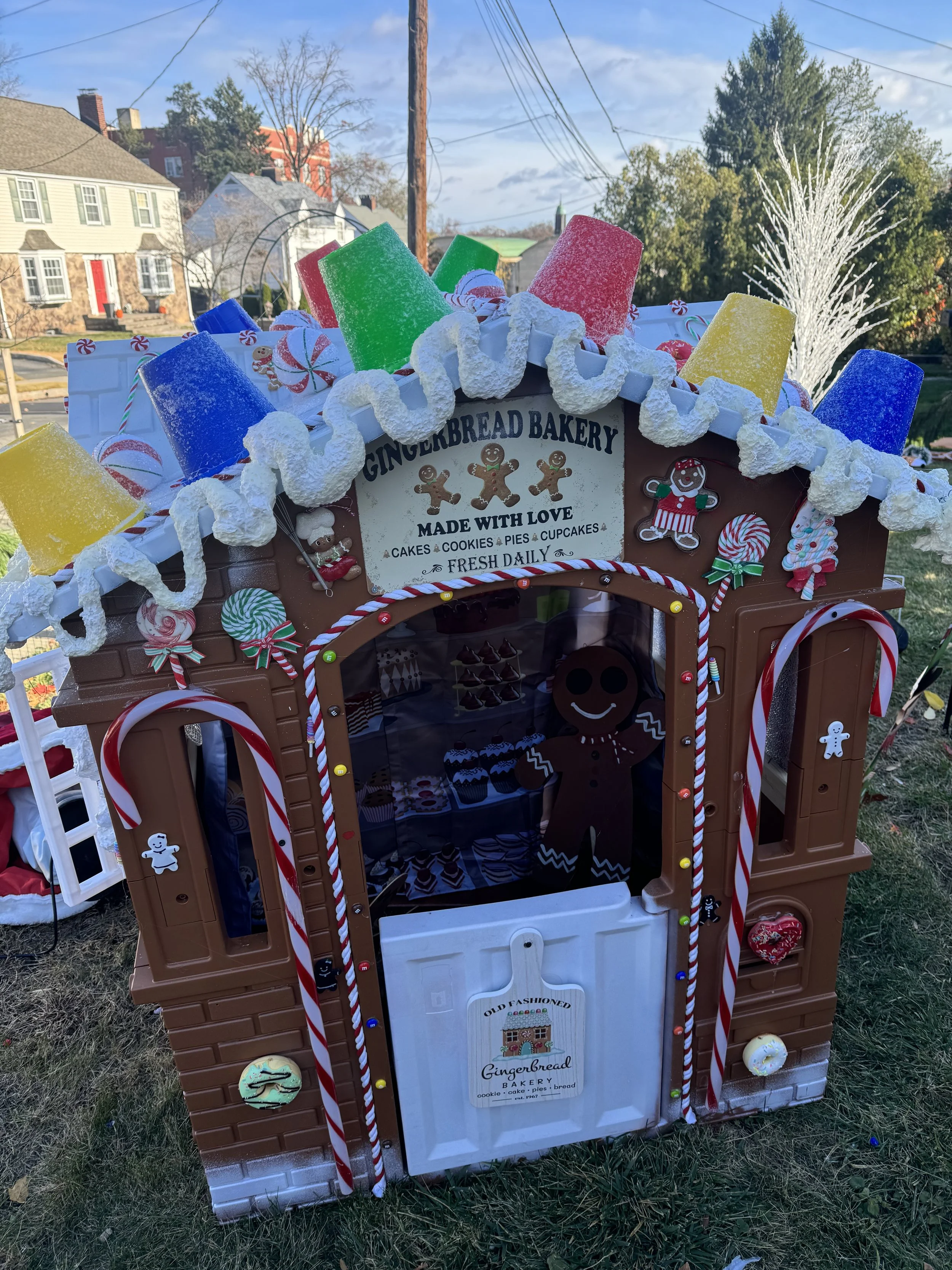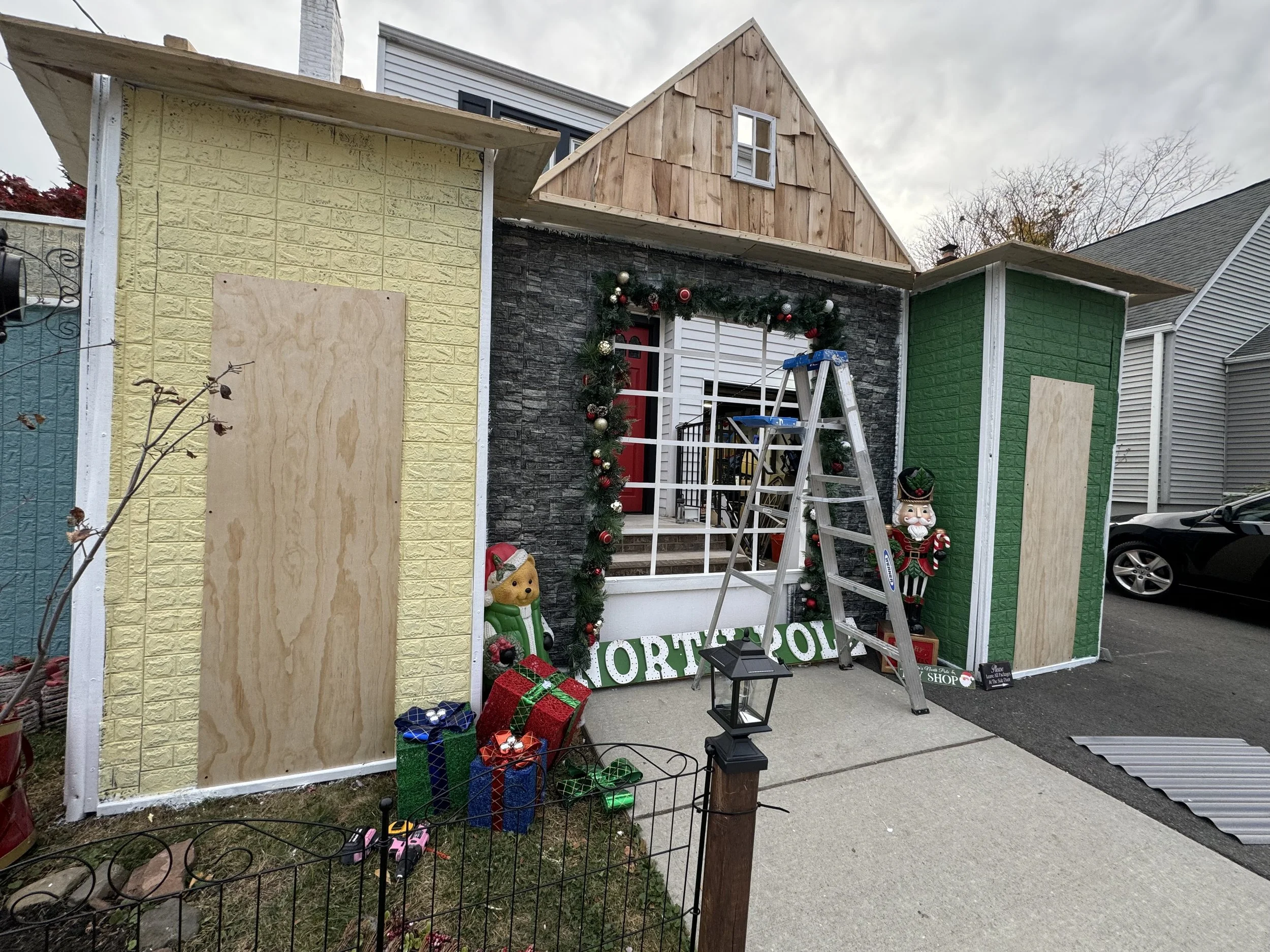 I started mostly using old playhouses. I would repaint them and decorate them and try to create a mini village in the yard. Kids loved that and it was a rather easy way to make props and repurpose our playhouses! I used the same playhouses year after year for many holidays! When we'd have a walk through display, the kids loved peaking inside them and checking out all the little details. Within the past year, I’ve gotten rid of many of them and try to mostly build more life size facades and props but I like to throw in a little playhouse here and there still! It’s so fun to decorate and paint them!