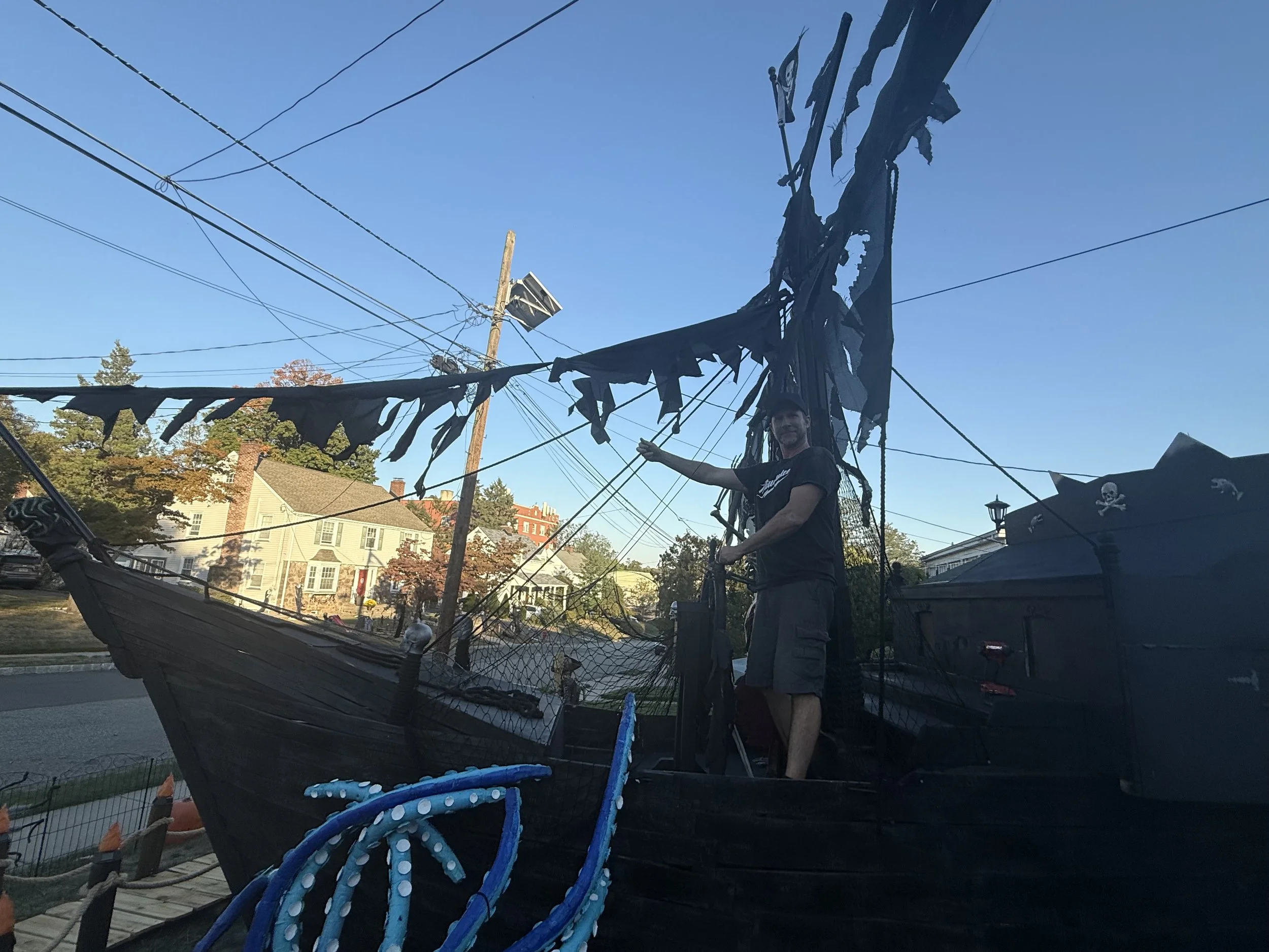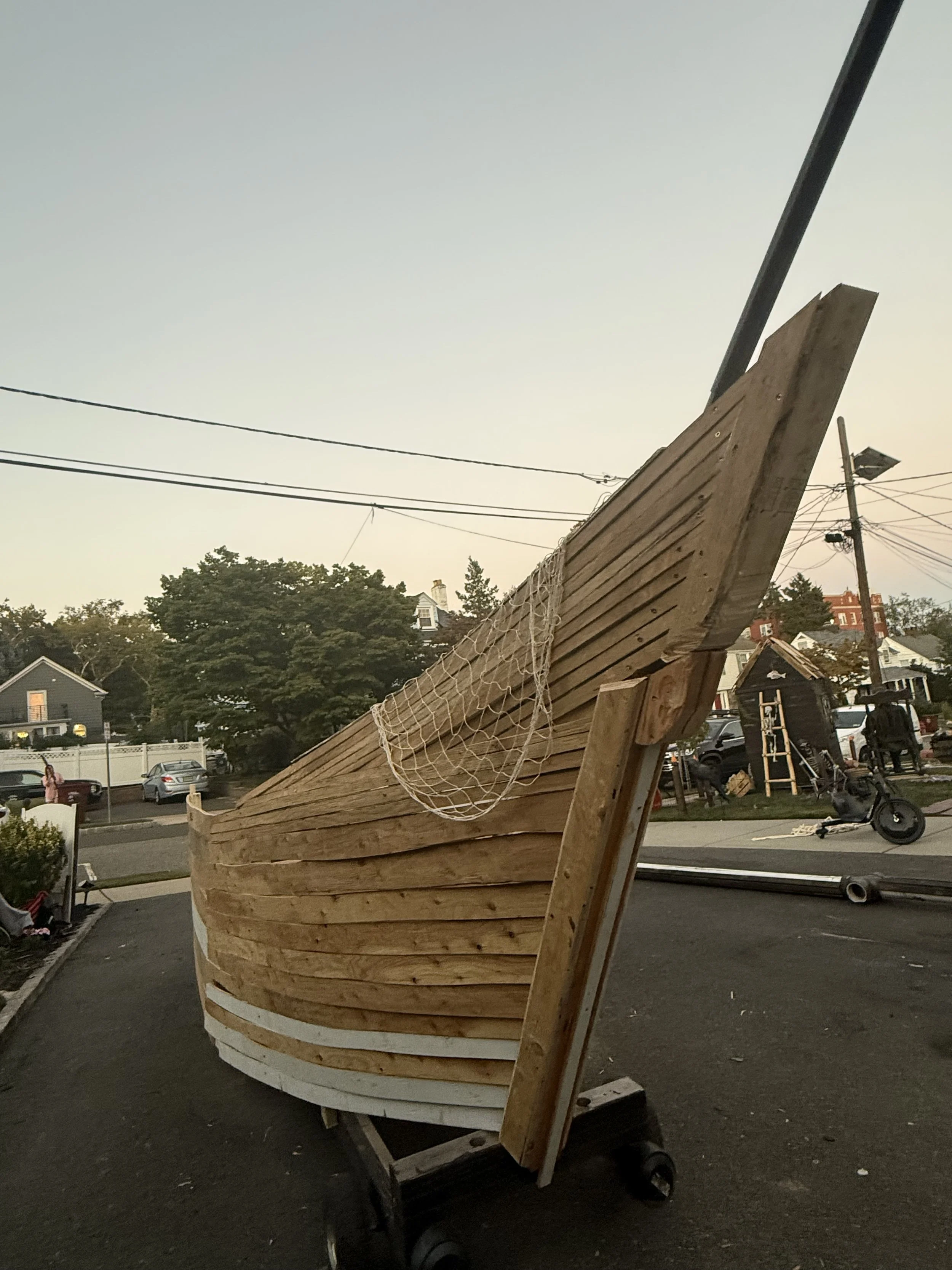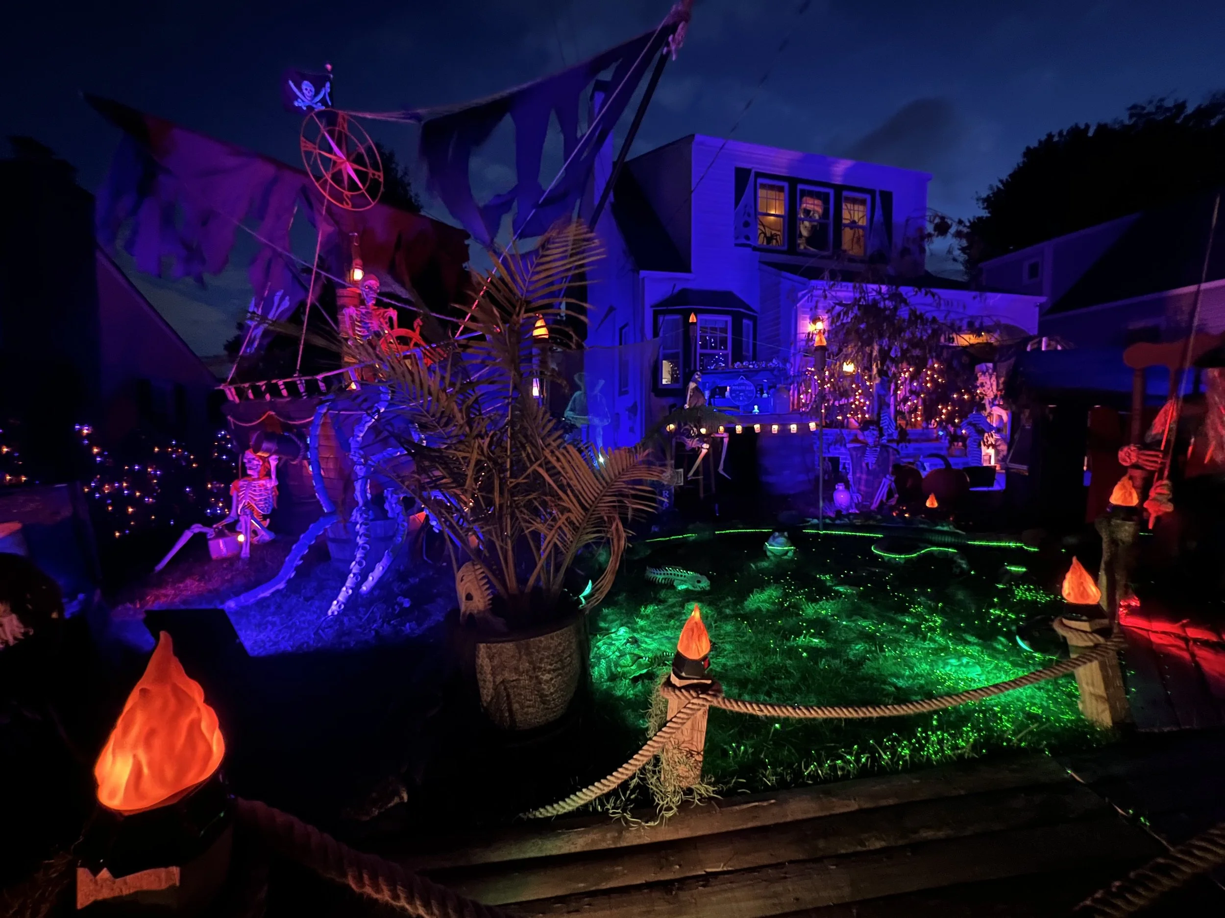 A lot of visitors will ask me how long it takes to put this up. It took us approximately 12 days to get most of the display up. We are still building some of it as I type! But for the most part, almost 2 weeks. Also, it took my husband only about 2 weeks to build this ship from scratch!! He doesn’t mind working at the last minute and under pressure! Me, on the other hand, I like to start my props very early (July) because I work on them a little at a time during the summertime. Usually I go out for even 10-20 min to work on something. There’s a lot of props for me to build and I’m also making shades at the same time, so I like to squeeze it in whenever I can and start early in the summer! Thankfully, my husband is usually very on board with my plans and is also extremely handy. Many of the ideas are his and he usually works off my initial ideas and makes the ideas even better! We work very well as a creative, builder team!