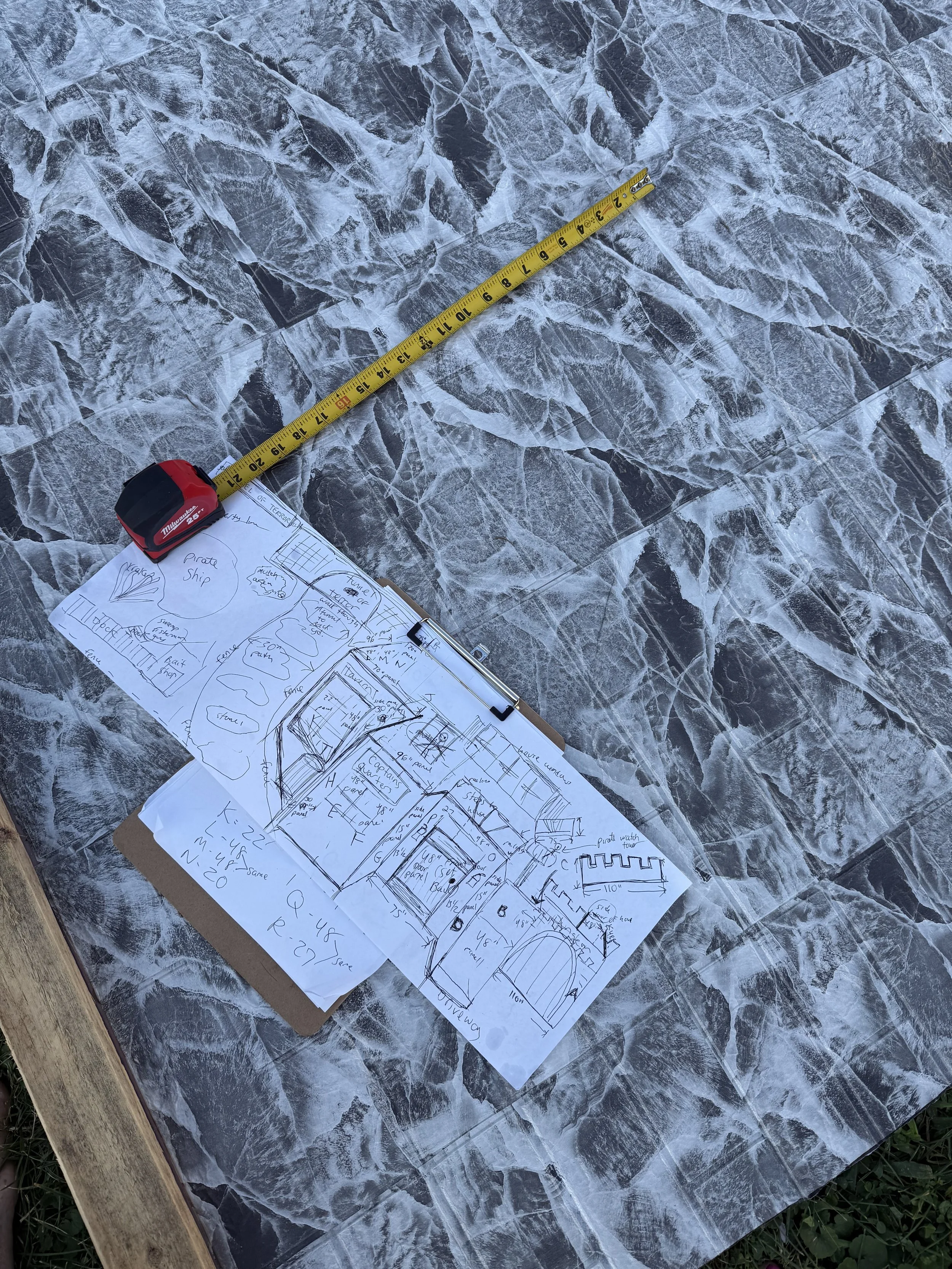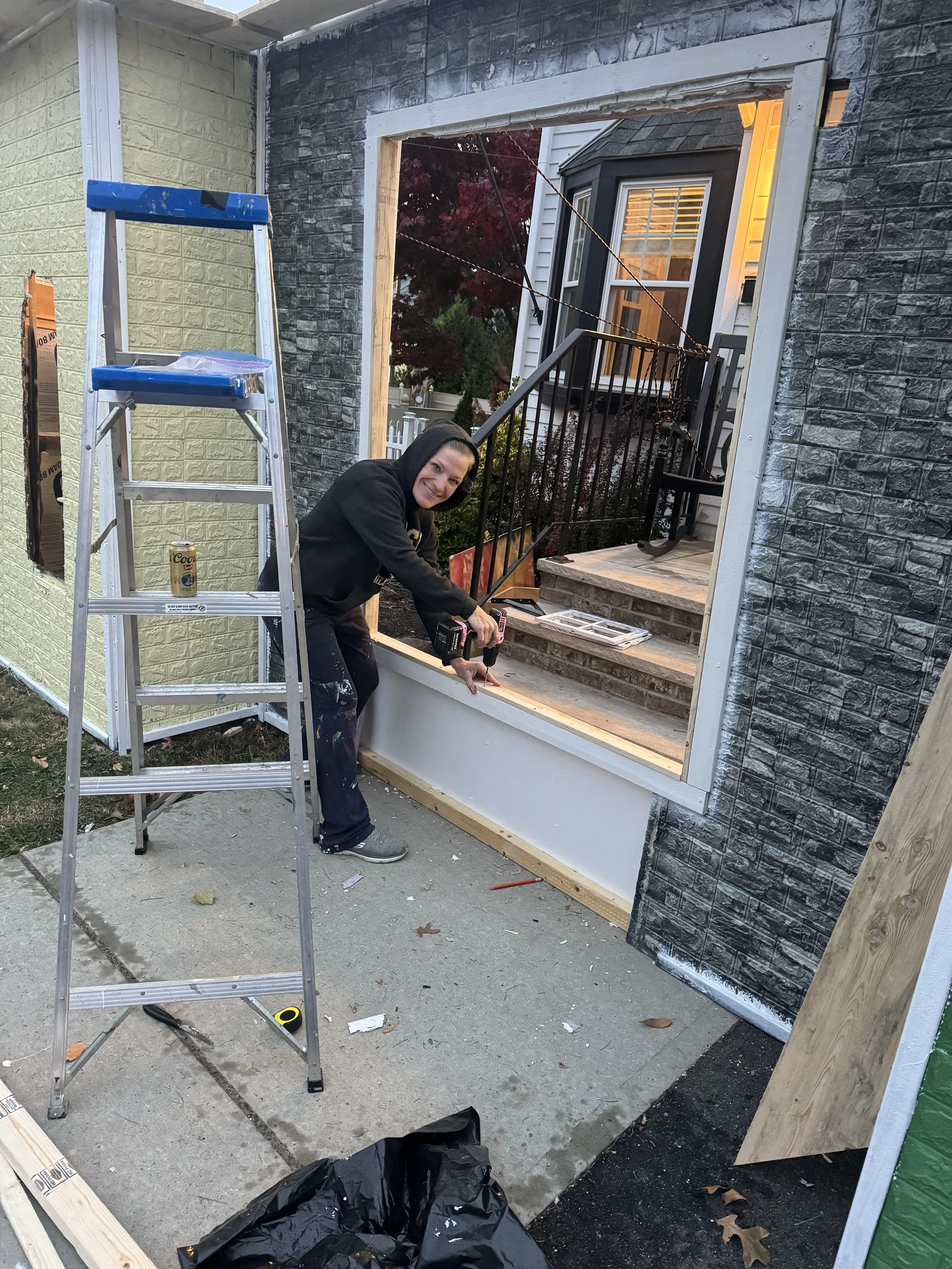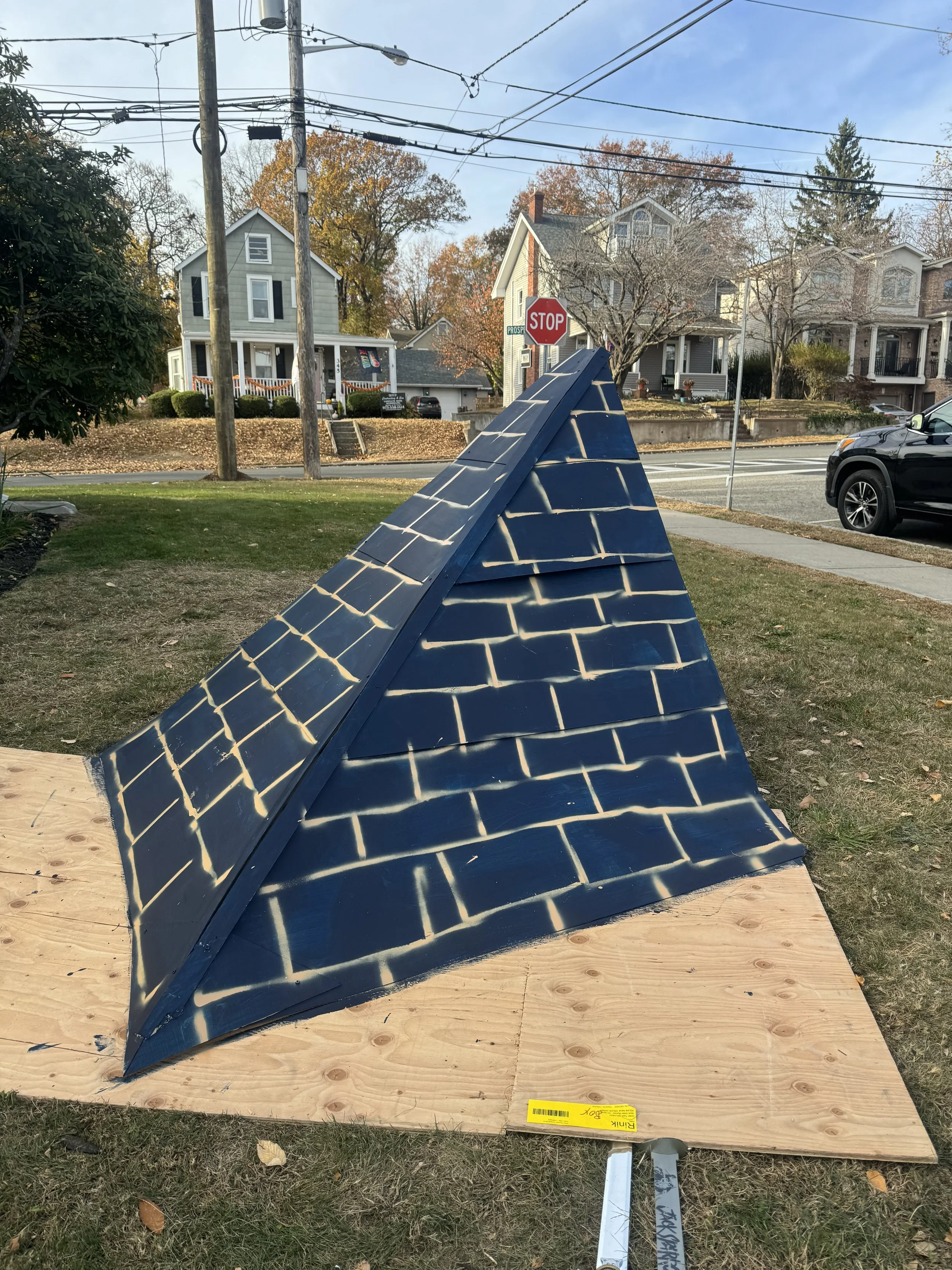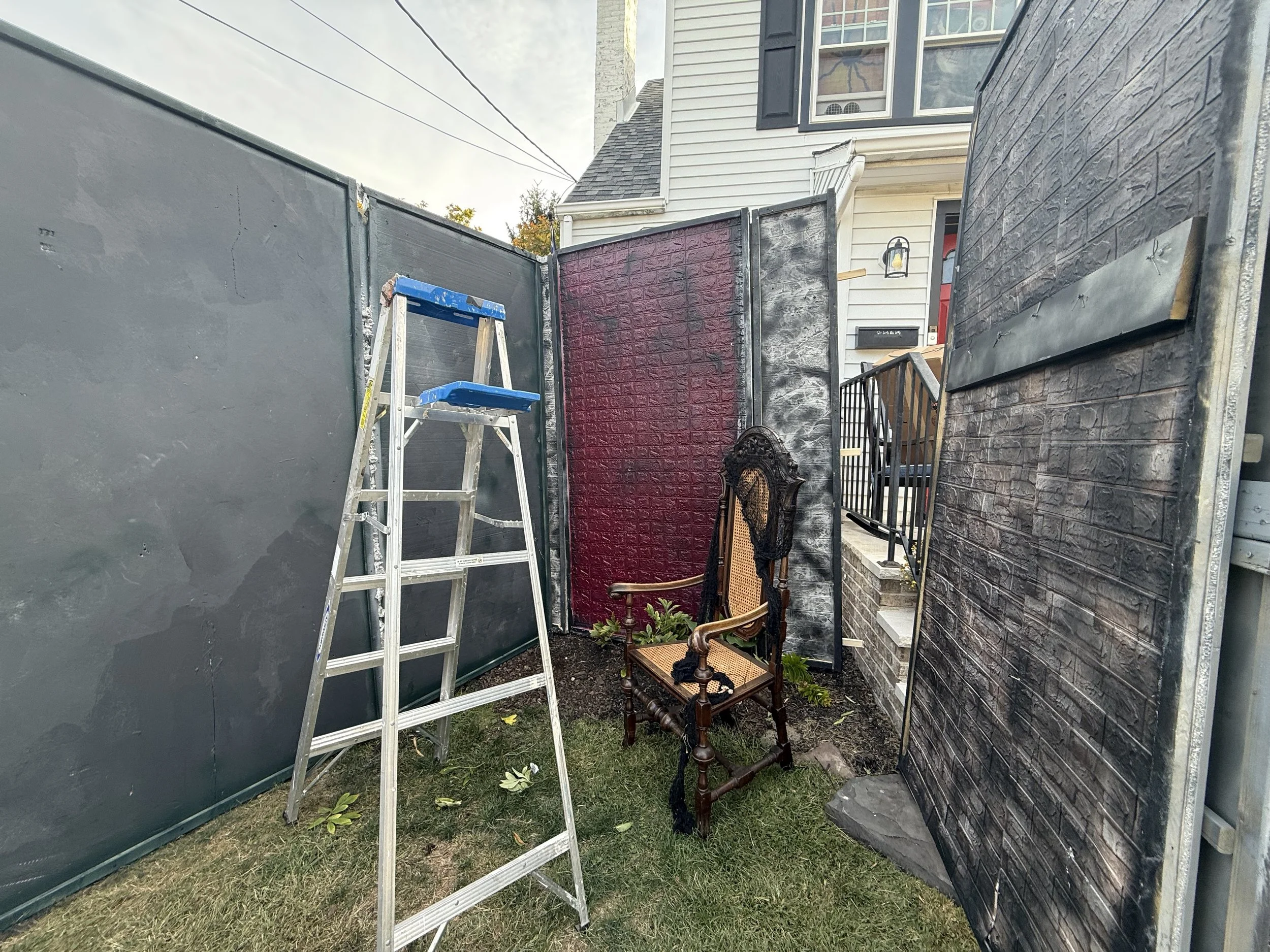 I already had some of the walls that I used for the facade. I used them 3 times now. Once, for a castle we made in 2024 for Halloween. The castle was probably my favorite. I used foam boards from Lowes and then I got some fake stone 12 x 12 adhesive panels off Temu. They hold up nicely in the rain! The walls were rather light weight but held up so great. We decided to reuse them that Christmas and made a Christmas Village! I repainted the walls, added more walls, cut holes in them and totally re did the display but reused the same walls! This Halloween, I used the walls once again! I painted them, took doors off them and made them into windows, added some new walls etc. The hardest part is framing out each wall because I had to add wood to the front and back, just like a frame, so that the walls were sturdy and can attach to each other. Wood is also needed horizontally on the back of each wall for stability.