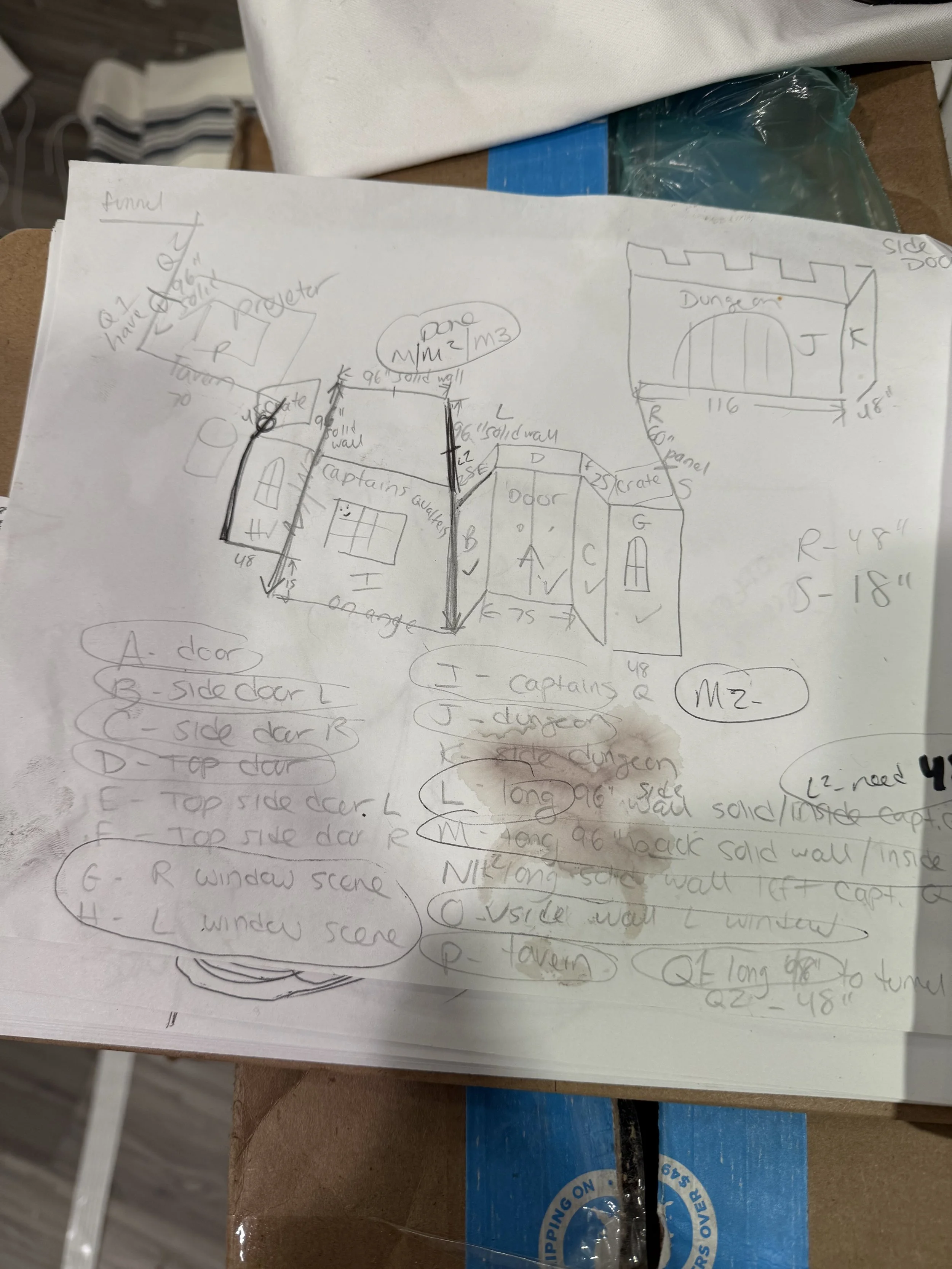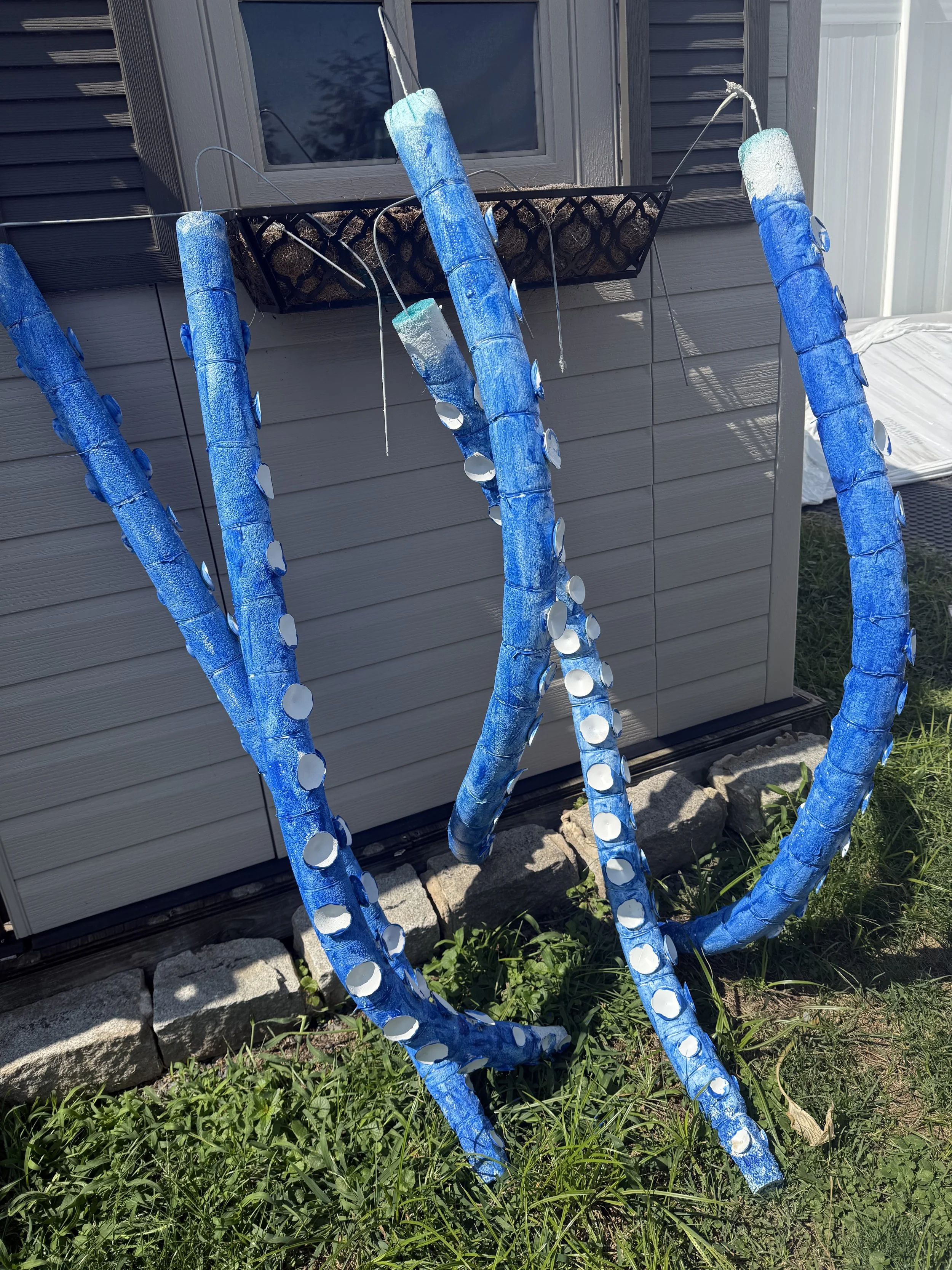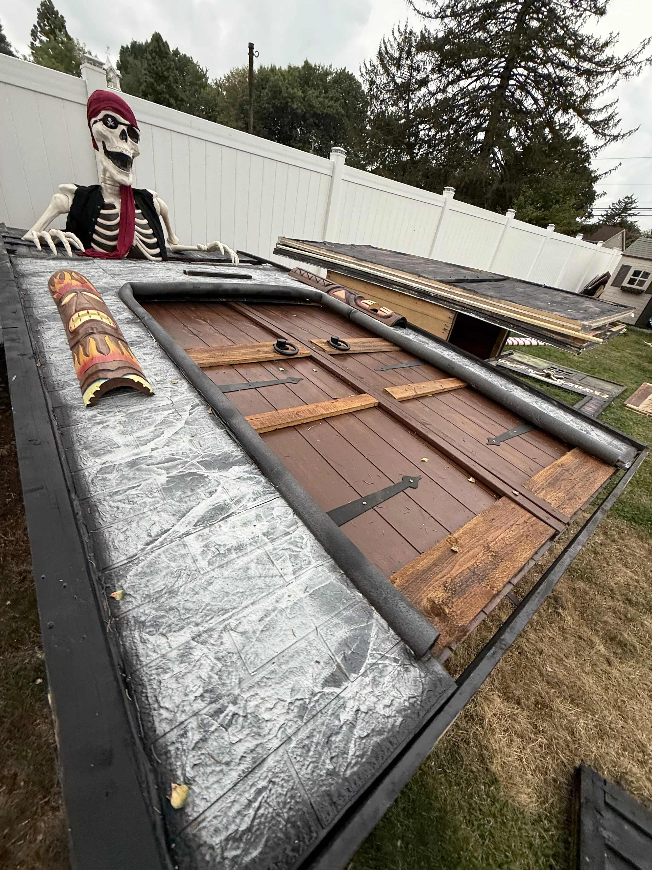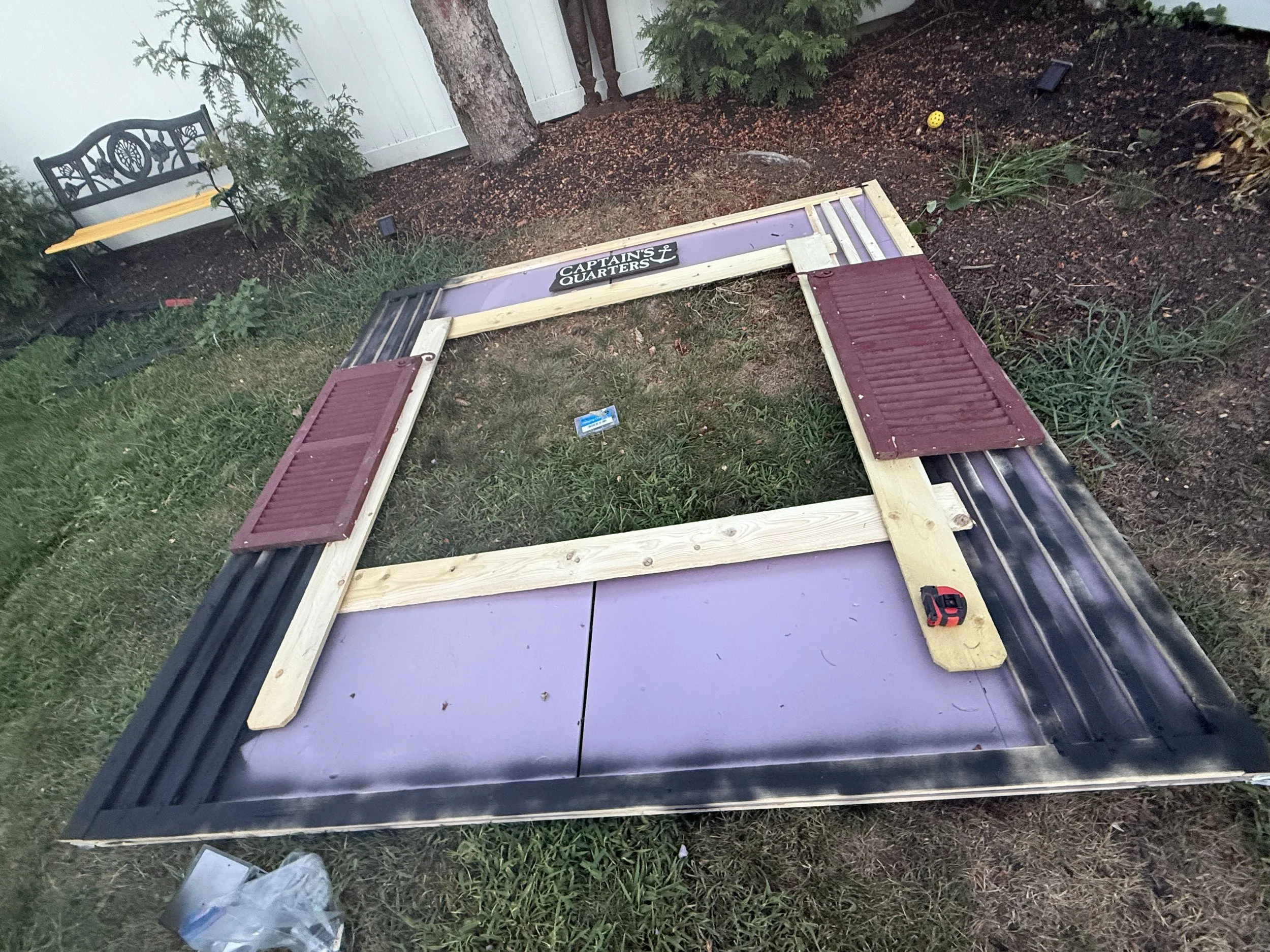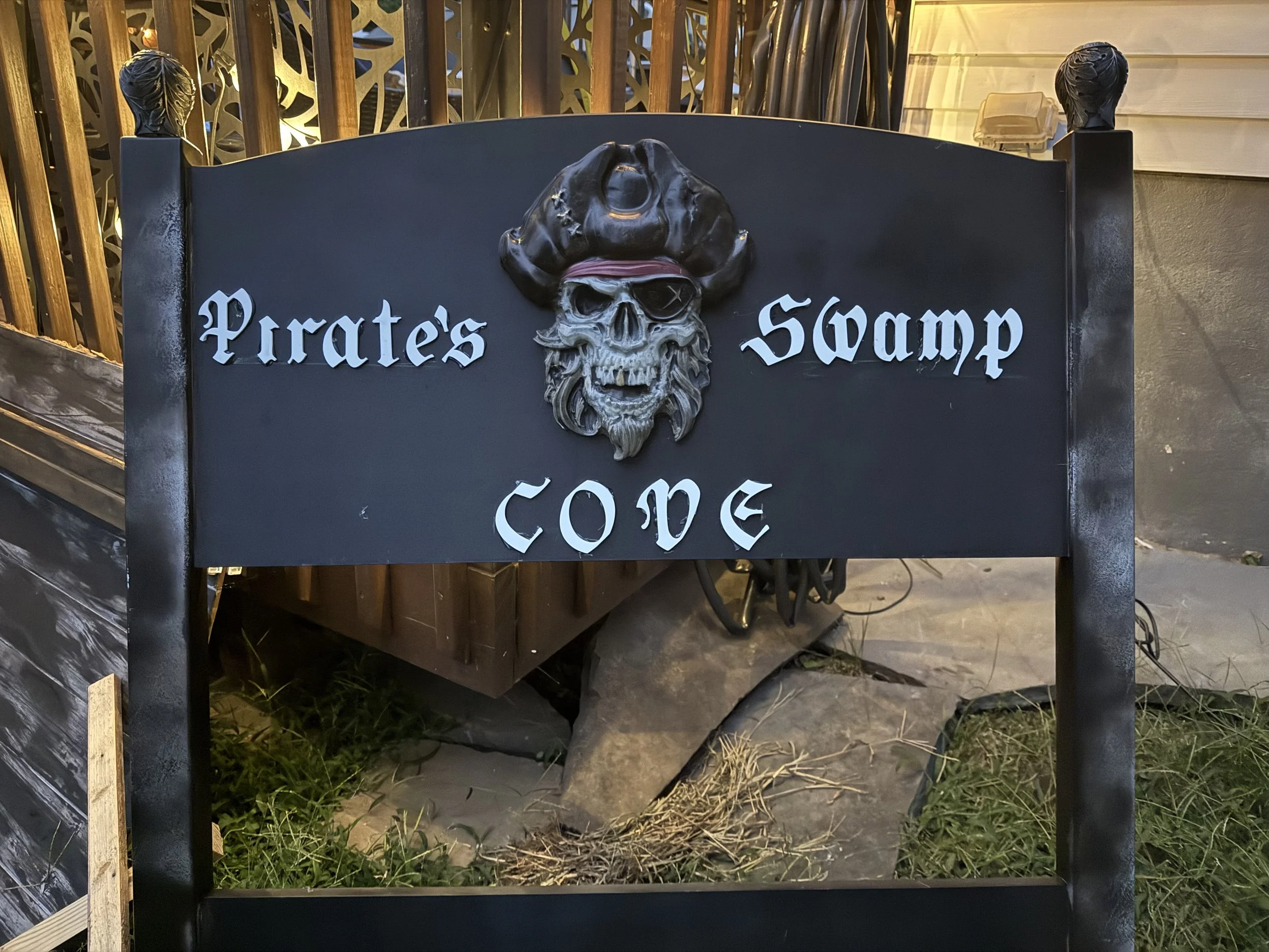 In August, I started to source some things and draft up my ideas on paper. We decided on Pirates as a theme, because we actually did pirates 2 years ago and it was a big hit. Not scary for kids and fun to build the ship and all. I began by slowly buying things for the pirates display. The first thing I got was pool noodles for the tentacles, which were a bit of a pain to make. It was my second time making them and they take hours and hours and layers of paint. They were probably my least favorite prop to make. LOL. This past summer, I took a few short car rides to pick up random things I found on Marketplace. I got vintage shutters and windows (used for bait shop) and an oar, a 100 year old throne chair for the Captains Quarters, some sconces, an old trunk for the treasure chest and I also took a trip to Good Will to get clothes and some other decor items for the pirates and Captains Quarters. I got free pallet cubes that we used to hold up the facade and I used one to make a bait shop! I try to find as many free or cheap items as possible so I’m often searching Marketplace