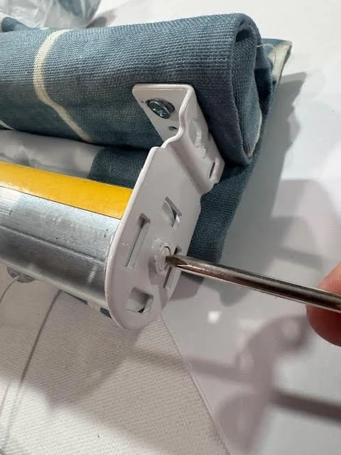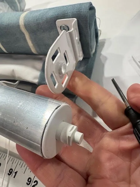 First remove the hardware covers on either side of the shade. They are the white covers on the ends. You slide them off and can easily pop them on when the shade is installed. You will want to press in on the one side of the end bracket (small circle) with something the size of a pen or small screwdriver to release the tube from the bracket. This is located on the right side if you have the liner side up. The tube will now detach from the side brackets. You will then drill your brackets into the top of the shade, through the fabric. Please be extra cautious that you are drilling them into the right part of the shade. You may want to predrill or drill slowly to avoid fabric from bunching. Hold shade wood up to the window with the tube and chain detached from the wood still. You will need two people to do this. Then drill the one hole that is showing on the brackets into your wall or trim (both sides). Make sure the shade is level. You will then put the tube back onto the brackets on the ends. You put the side with the chain on first, and then hold in the little button on the other side and pop the shade onto the bracket until you see it click into place. Replace white covers on the side brackets.